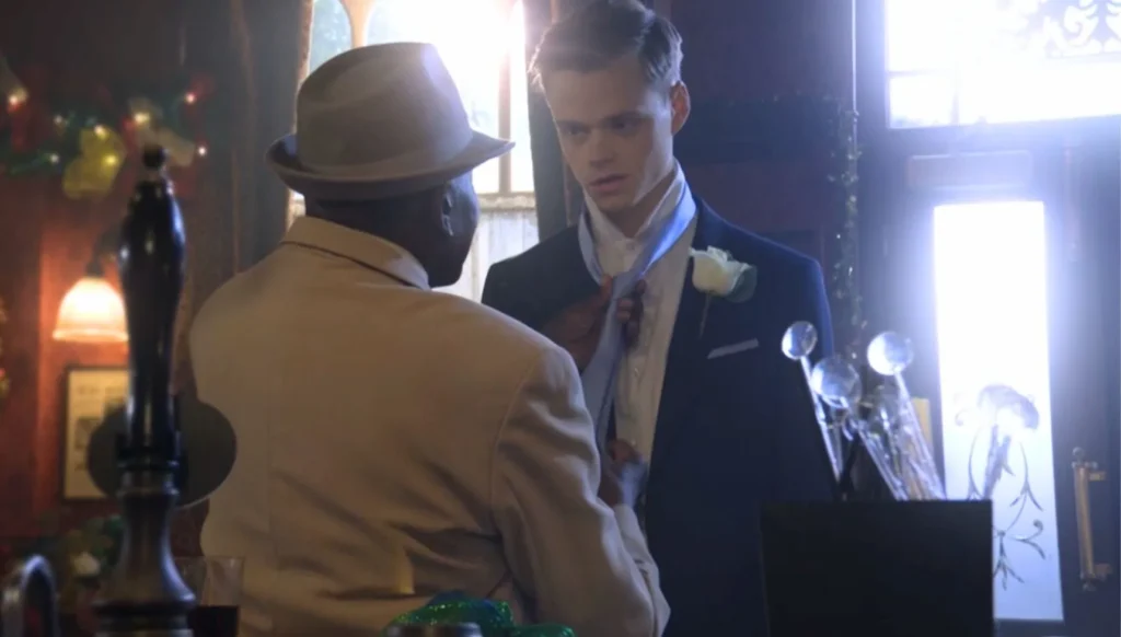 The moment comes halfway through the New Year episode, as Oscar asks Patrick to help with his tie.