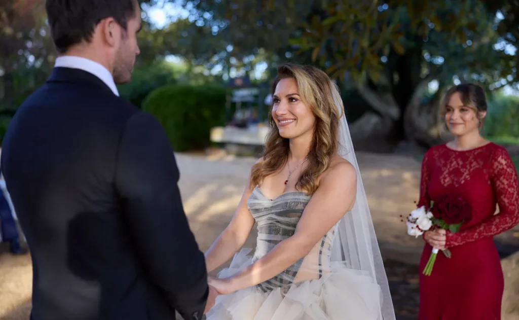 A later version of the promo confirmed Leah’s identity, as Justin (James Stewart) could also be seen running just behind her in a suit matching the one he wore to yesterday’s wedding.
